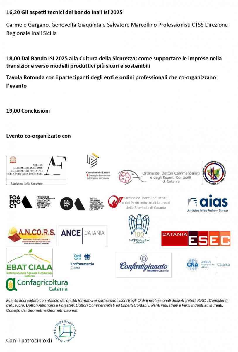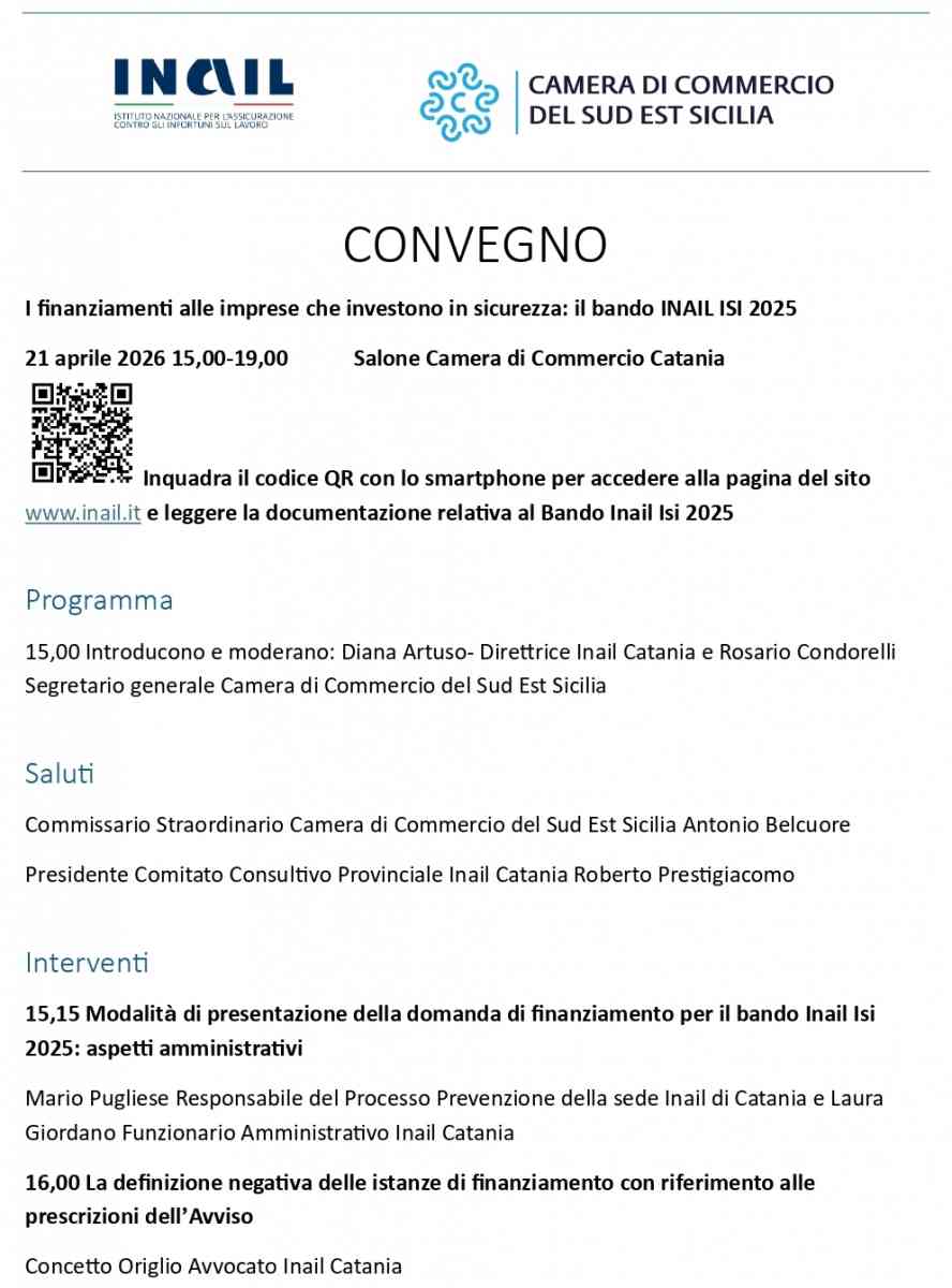 Il convegno rappresenta un’importante occasione di approfondimento tecnico e operativo sul Bando INAIL ISI 2025, strumento strategico a supporto delle imprese che investono nel miglioramento dei livelli di salute e sicurezza nei luoghi di lavoro e nella transizione verso modelli produttivi più sicuri e sostenibili. Gli interventi programmati offriranno un quadro completo sugli aspetti amministrativi, giuridici e tecnici del bando, favorendo un confronto diretto tra istituzioni, professionisti e sistema produttivo.