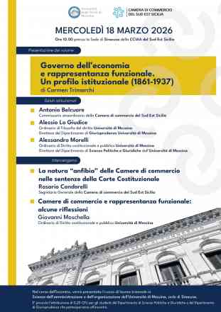 • Governo dell’economia e rappresentanza funzionale. Un profilo istituzionale (1861-1937) di Carmen Trimarchi  MERCOLEDÌ 18 MARZO 2026 Ore 10.00 presso la Sede di Siracusa della CCIAA del Sud Est Sicilia